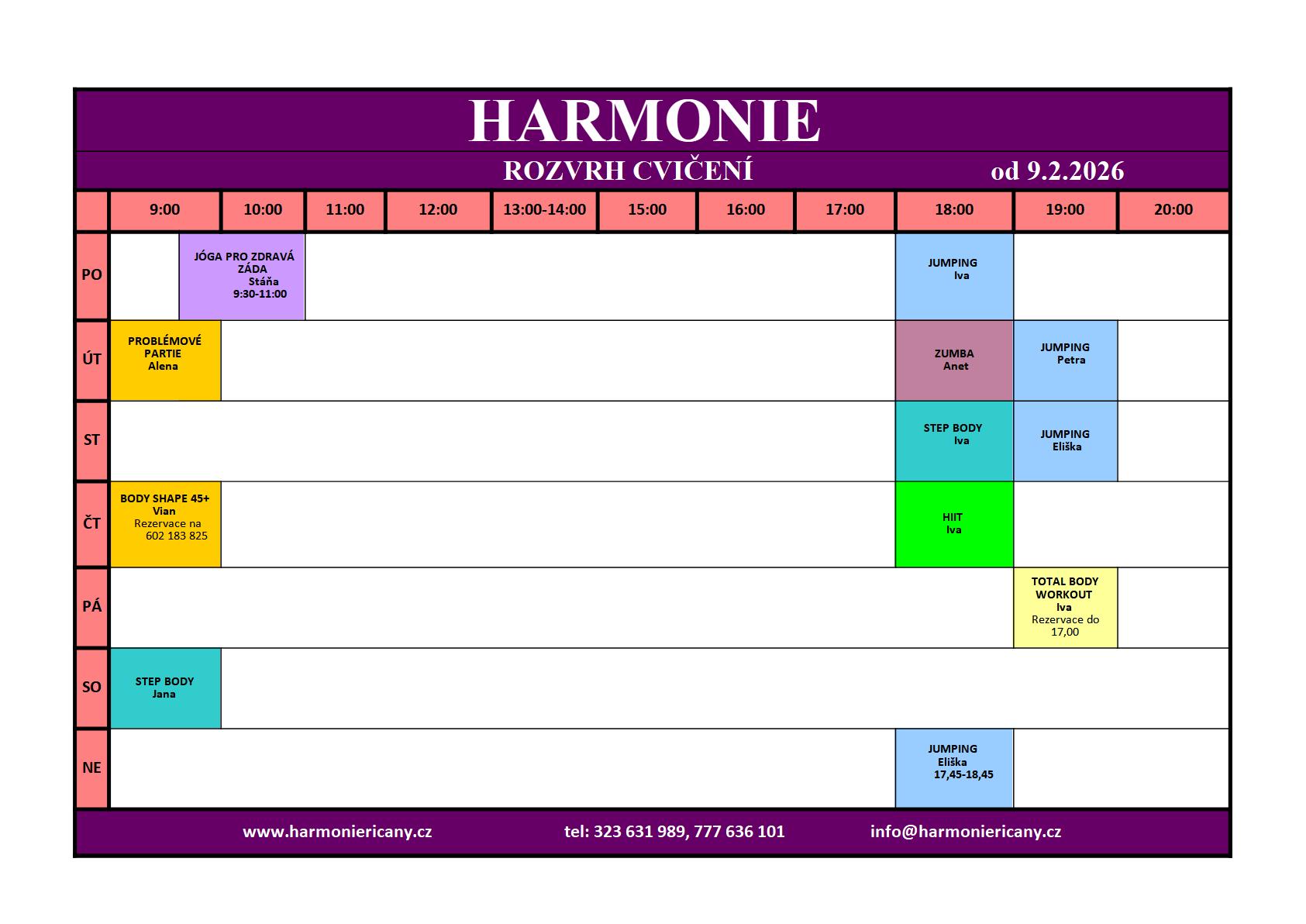 Studio Harmonie nabízí velmi širokou nabídku skupinového cvičení. Věříme, že si každý z vás vybere to pravé – cvičení pro spalování tuků, formování postavy, pro zpevnění a protažení celého těla, pro zdraví a rehabilitaci nebo i pro zábavu a dobrou náladu.